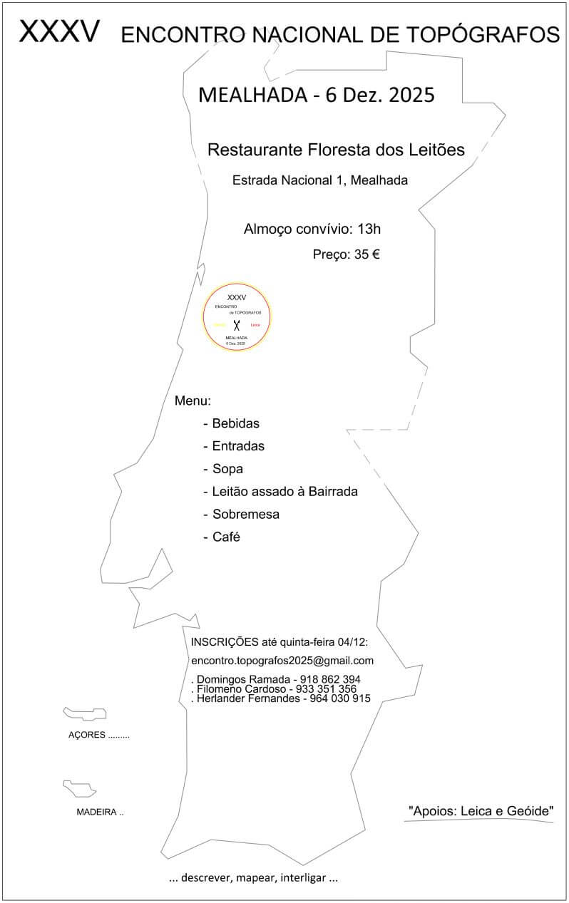 Como vem sendo hábito, vai decorrer o XXXV Encontro Nacional de Topógrafos, desta vez no Restaurante Floresta dos Leitões, na Mealhada.