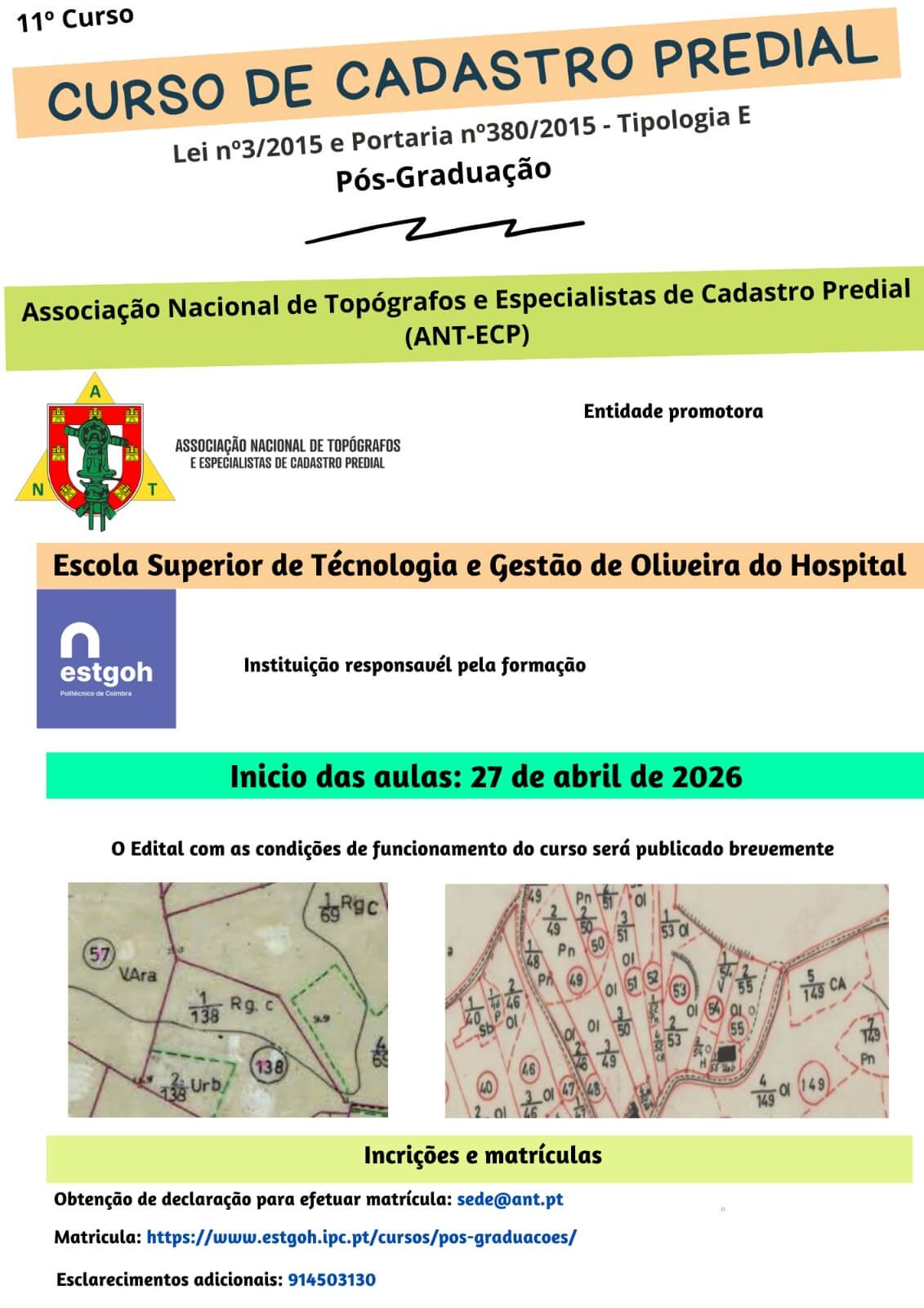 A Associação Nacional de Topógrafos e Especialistas de Cadastro Predial (ANT-ECP) anunciou a realização do 11.º Curso de Cadastro Predial – Tipologia E, enquadrado na Lei n.º 3/2015 e na Portaria n.º 380/2015, em formato de pós-graduação.