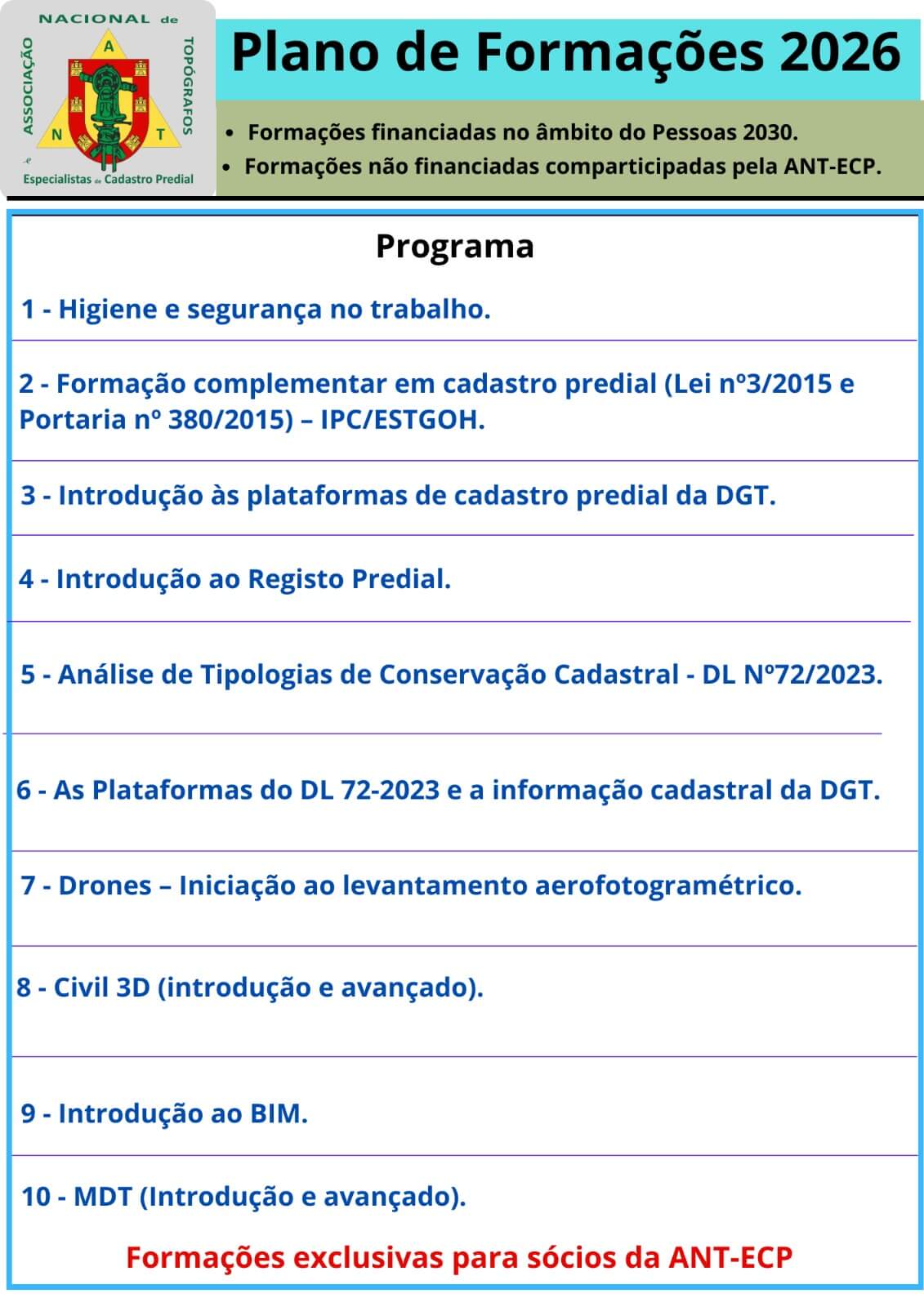 O plano integra formações financiadas no âmbito do programa Pessoas 2030, bem como ações não financiadas, comparticipadas pela ANT-ECP, todas direcionadas para o desenvolvimento de competências nas áreas do cadastro predial, topografia e tecnologias associadas.